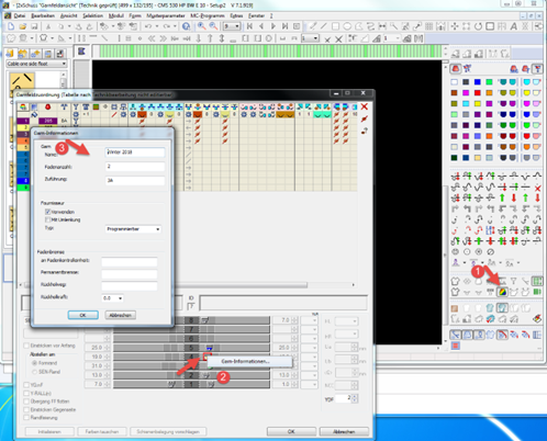 (1) Garnfeldzuordnung öffnen, (2) Garn-Informationen auf einem Fadenführer aufrufen, (3) Garn-Id, exakt wie im PPS hinterlegt, eingeben.